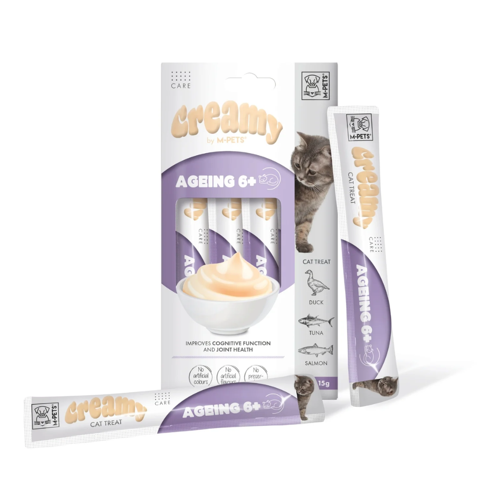 Apoie o seu gato à medida que envelhece com a nossa fórmula “Creamy Cat Treat Ageing 6”. A nossa receita especial inclui delicioso pato, atum e salmão para apoiar a função cognitiva e a saúde das articulações. Com elevado teor de humidade e sem aditivos artificiais, é um petisco saboroso e nutritivo para o seu gato sénior.